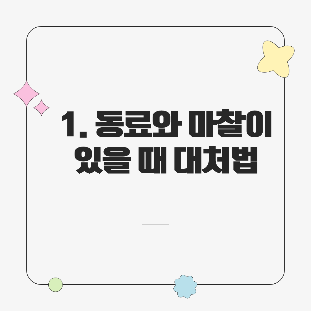 근무를 하다보면 어디 가나 동료와 트러블 또는 갈등 또는 마찰이 있습니다. 특히 학교에서의 업무는 동료와의 소통과 협동이 중요하므로 동료들과의 인간관계를 유지하는 것이 중요합니다. 마찰이 생겼을 때 더 큰 갈등을 만들지 않기 위해서는 감정을 나타나는 발언을 자제해야 합니다. 나중에 만나서 동료와 소통하는 것이 중요합니다.