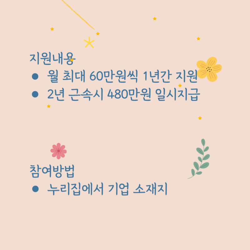 - 지원내용 : 신규채용 청년 1인당 월 최대 60만원씩 1년간 지원, 최초 채용 후 2년 근속 시 480만원 일시지급(2년간 최대 1,200만원)입니다.
